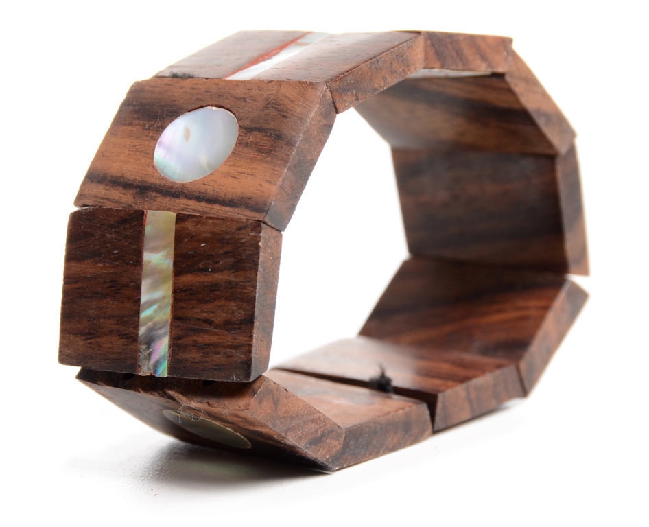 Dieses einzigartige Modeschmuck-Armband aus Holzplättchen mit Perlmutt-Einlegearbeiten ist eine liebevolle Handarbeit aus Bali.
