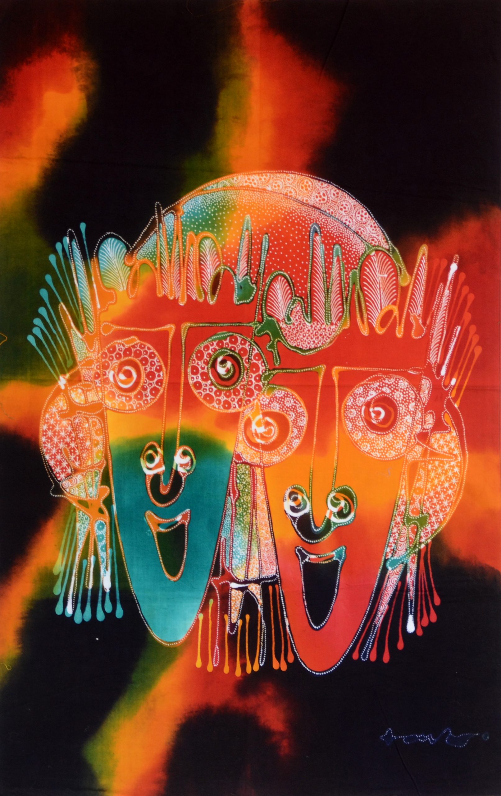 Balinesisches Batik Stoffbild mit 2 lachende Masken – ein einzigartiges Kunstwerk