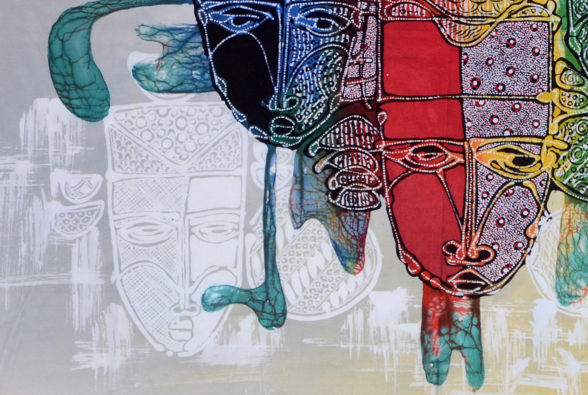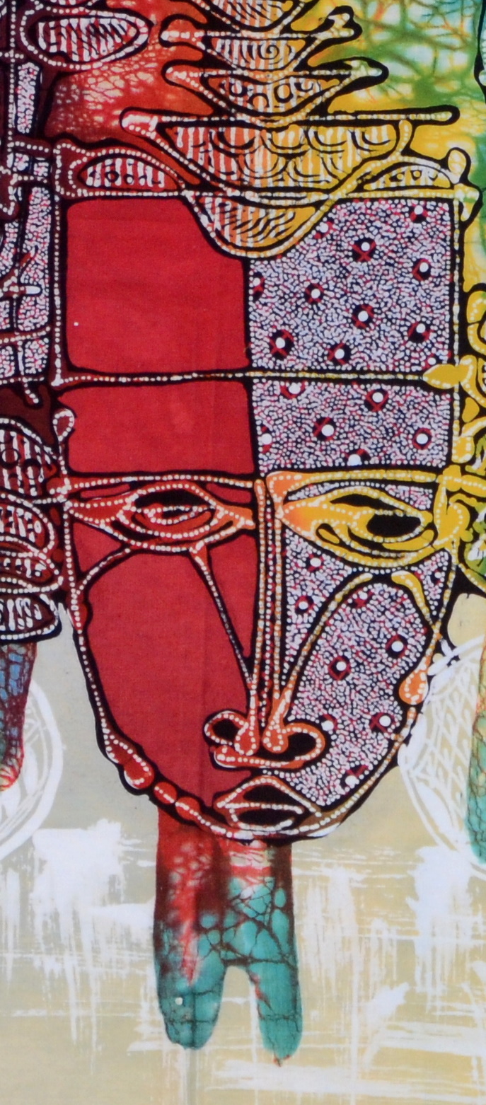 Mit dem schönen Masken-Trio in lebendigen Farben, ist dieses Batik-Kunstwerk einzigartig und nur einmal verfügbar.