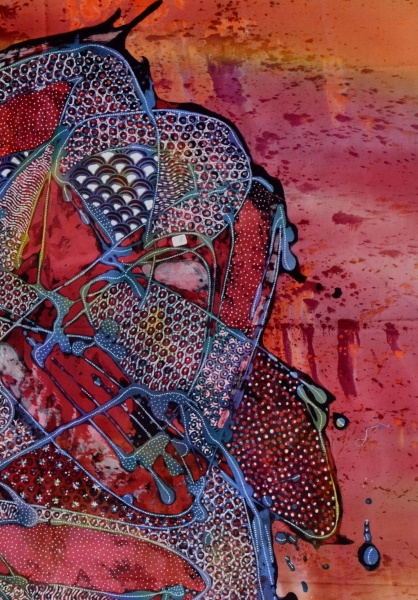 Sehr schön wirkt dieses Batik-Stoffbild in einem rahmenlosen Bilderrahmen oder aufgespannt auf einen schönen Rahmen.