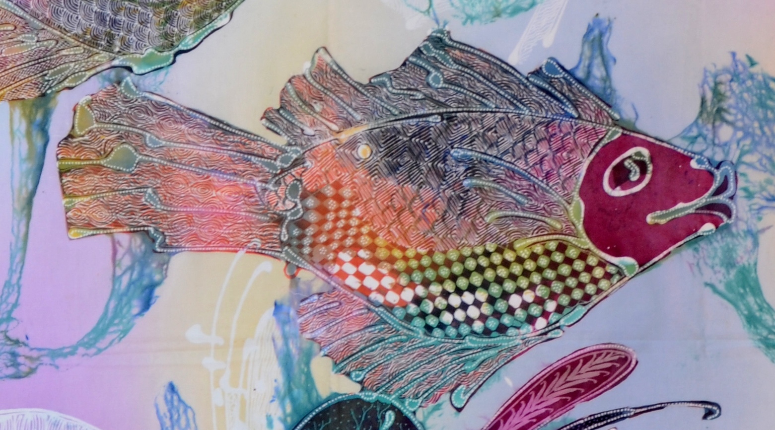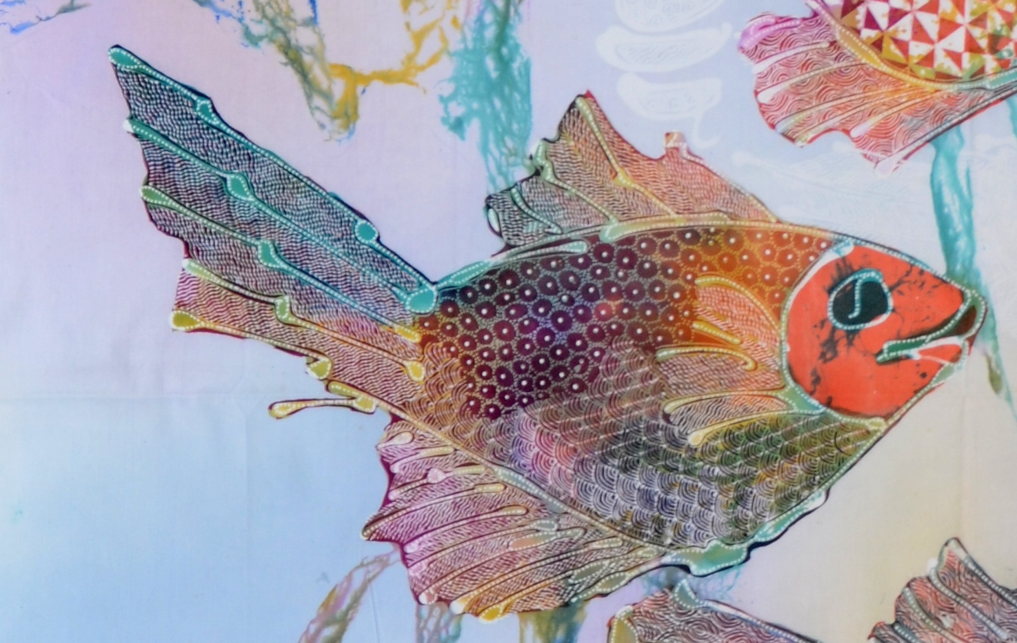 Mit dem schönen Fische-Trio-Motiv in besonderen Farben, ist dieses Batik-Kunstwerk einzigartig und nur einmal verfügbar.