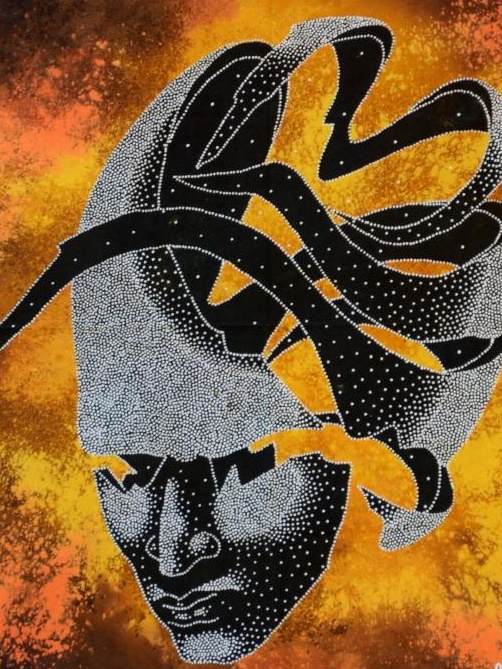 Balinesisches Batik Stoffbild mit einer phantasievollen Maske – ein einzigartiges Kunstwerk