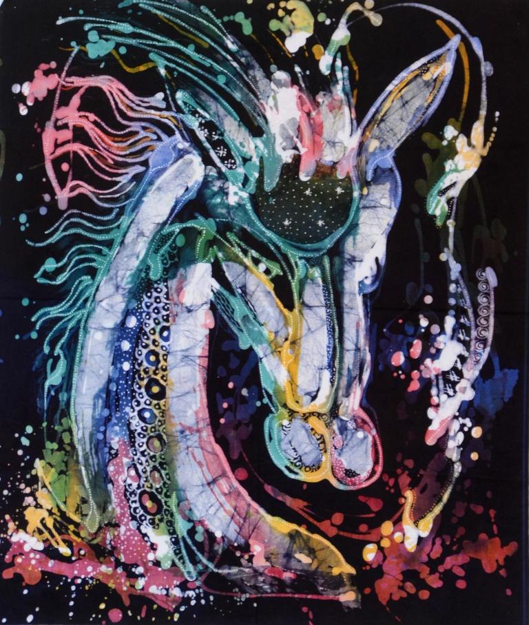 Balinesisches Pferdekopf Batik Stoffbild – ein farbenfrohes Unikat und wahrer Blickfang