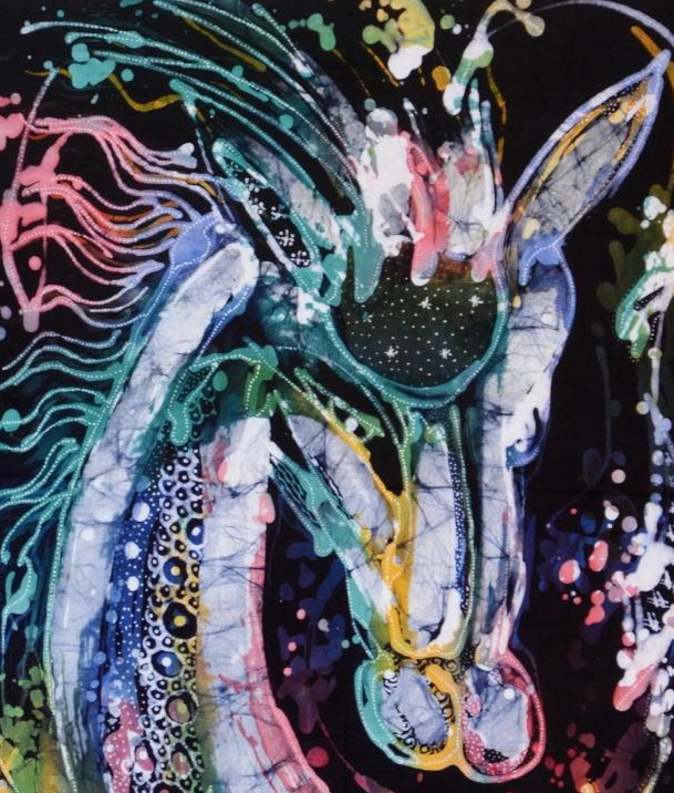 Mit dem schönen Pferdekopf in lebendigen Farben, ist dieses Batik-Kunstwerk einzigartig und nur einmal verfügbar.