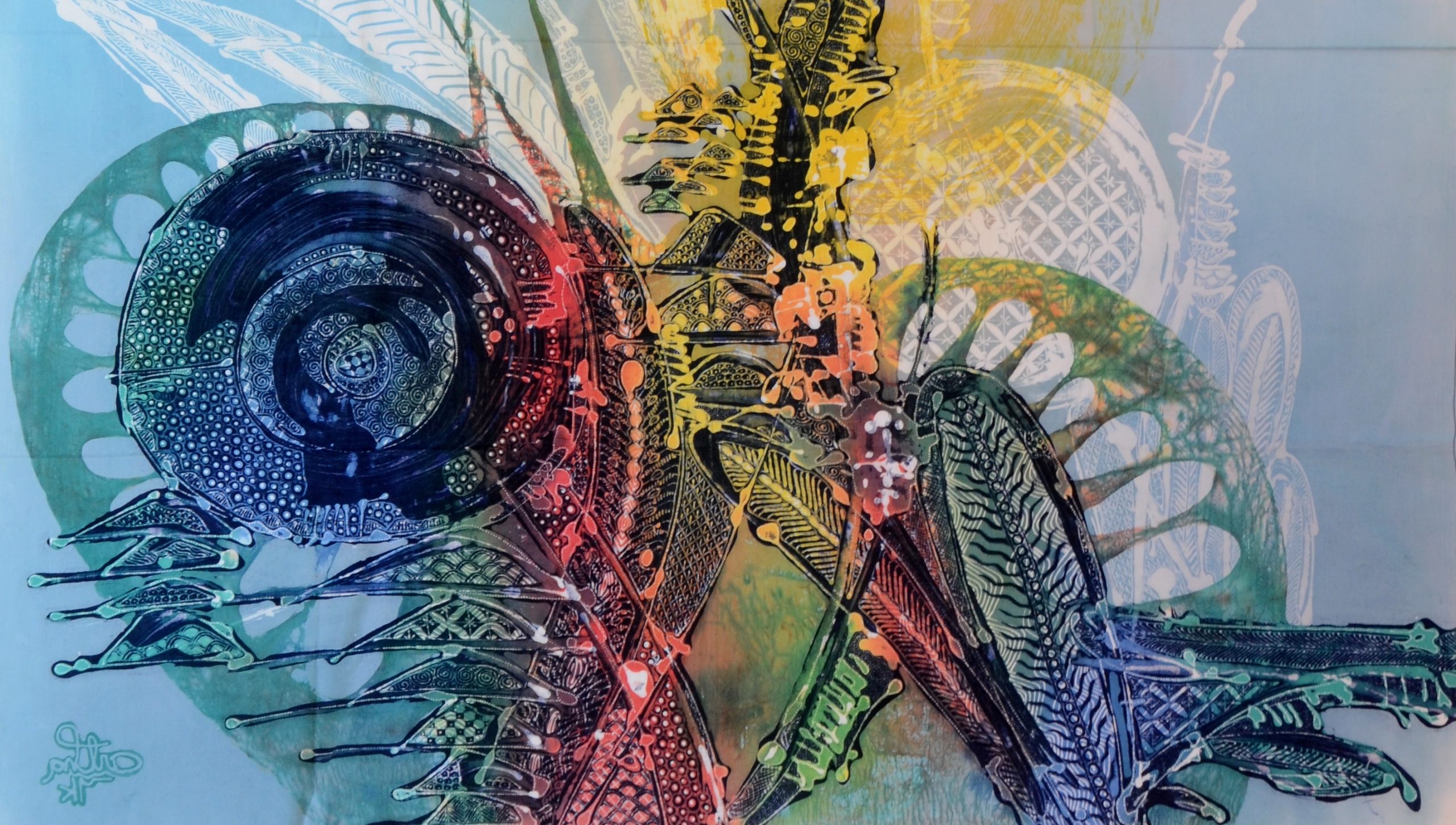 Gefertigt mit natürlichen Farbpigmenten und in traditioneller Batik-Arbeit hergestellt, zeigt dieses Bild ein farbenschönes abstraktes Motiv.