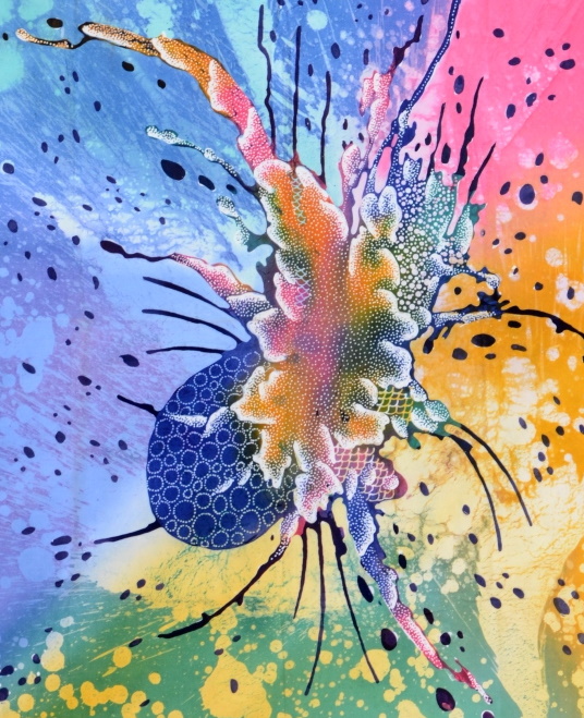 Balinesisches Batik-Bild mit farbenfrohen abstrakten Quallen-Motiven – ein einzigartiges Kunstwerk