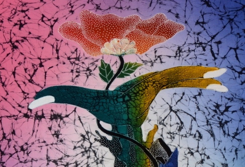 Gefertigt mit natürlichen Farbpigmenten und in traditioneller Batik-Arbeit hergestellt, zeigt dieses Bild ein farbenschönes Motiv.