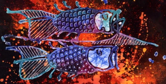 Batik Bild Stoffbild bunte Fische, 45 x 50 cm