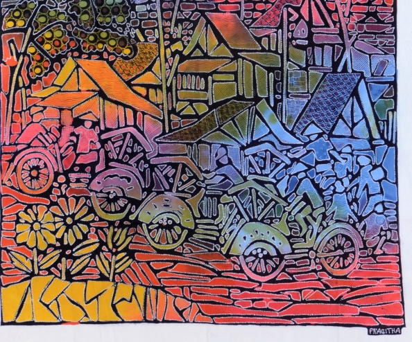 Batik Bild Stoffbild Dorfleben, 75 x 90 cm – verkauft