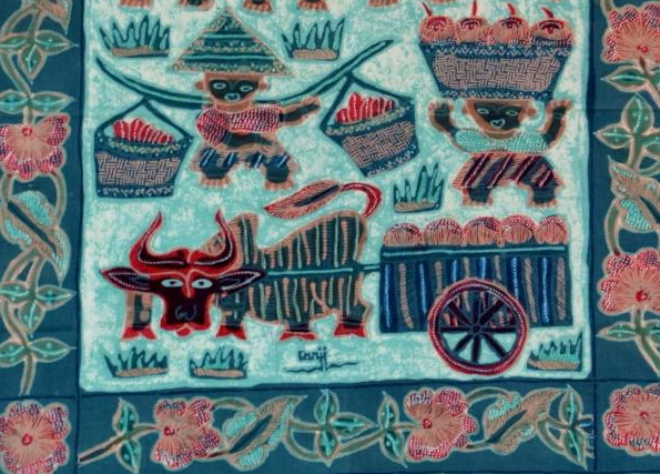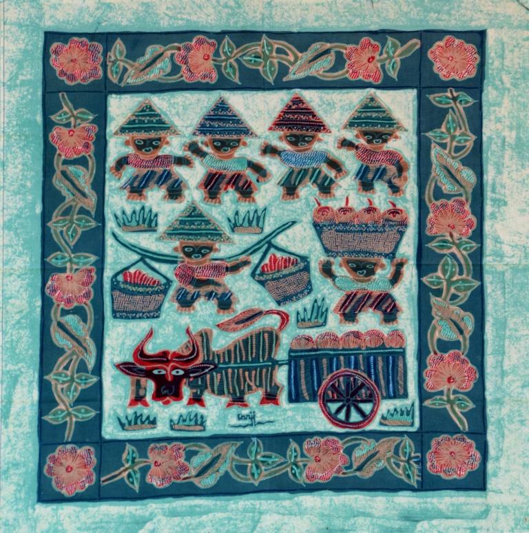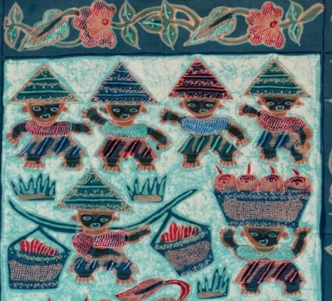Das Motiv besteht aus einigen kleinen Figuren und wurde mit natürlichen Farbpigmenten in traditioneller Batik-Technik hergestellt.