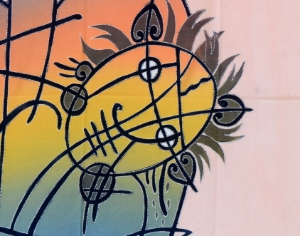 Gefertigt mit natürlichen Farbpigmenten und in traditioneller Batik-Arbeit hergestellt, zeigt dieses Bild ein abstraktes Motiv von 75 x 90 cm Größe.