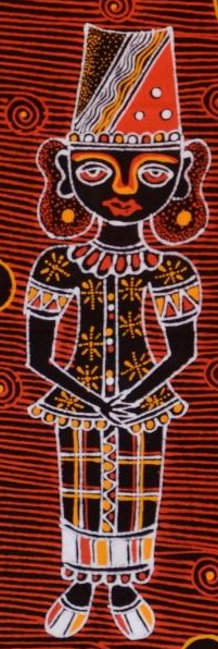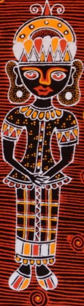 Das Motiv besteht aus einem traditionellen Trachtenpaar und wurde mit natürlichen Farbpigmenten in traditioneller Batik-Technik hergestellt.