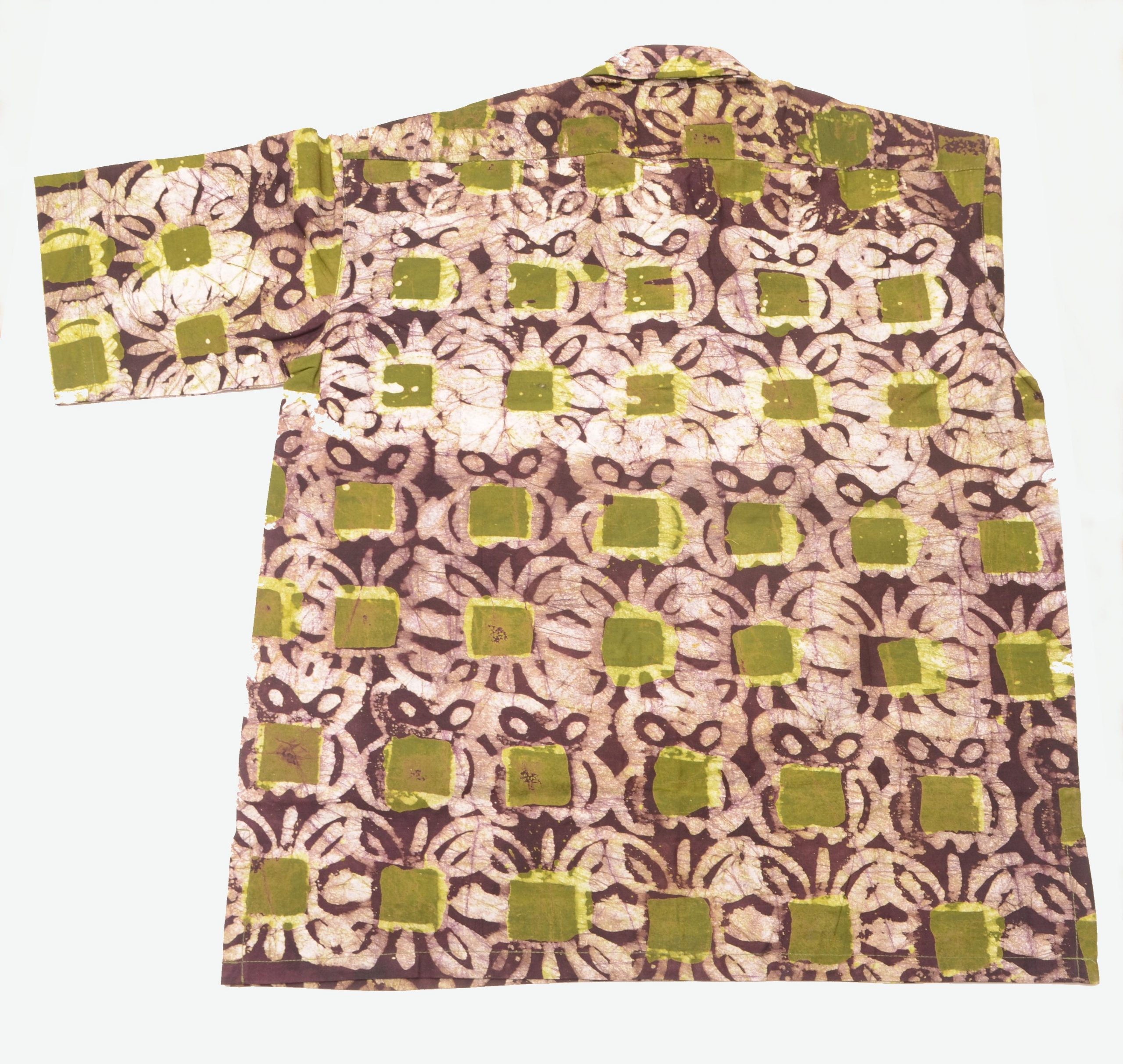 Das kurzärmlige Hemd verfügt über ein einzigartiges Adinkra-Muster in den Farben Grün und Braun.