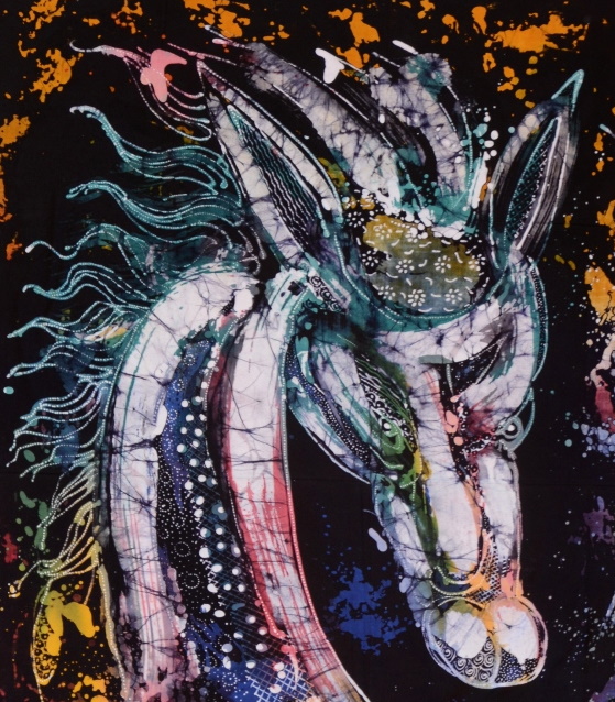 Das besondere Pferdekopf-Motiv wurde mittels aufgebrachtem Wachs in mehreren Arbeitsgängen vor dem Färben gestaltet, was dem Bild eine besondere Tiefe und Lebendigkeit verleiht.
