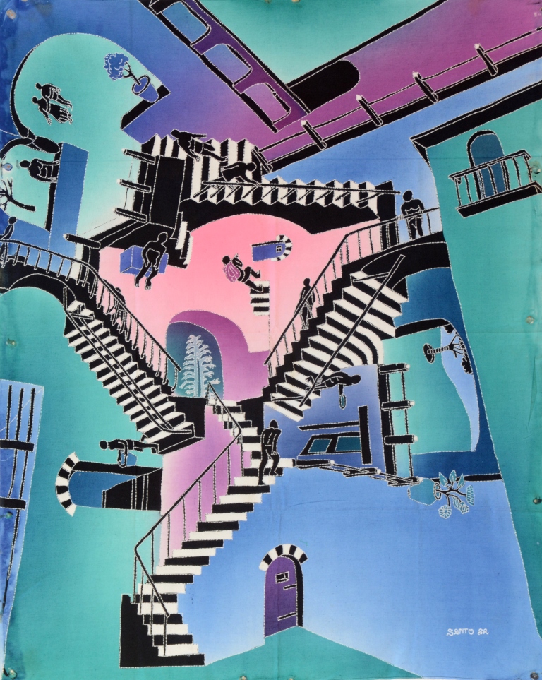 Balinesisches Batik Bild mit rundrum Treppen – ein farbenfrohes Unikat und wahrer Blickfang