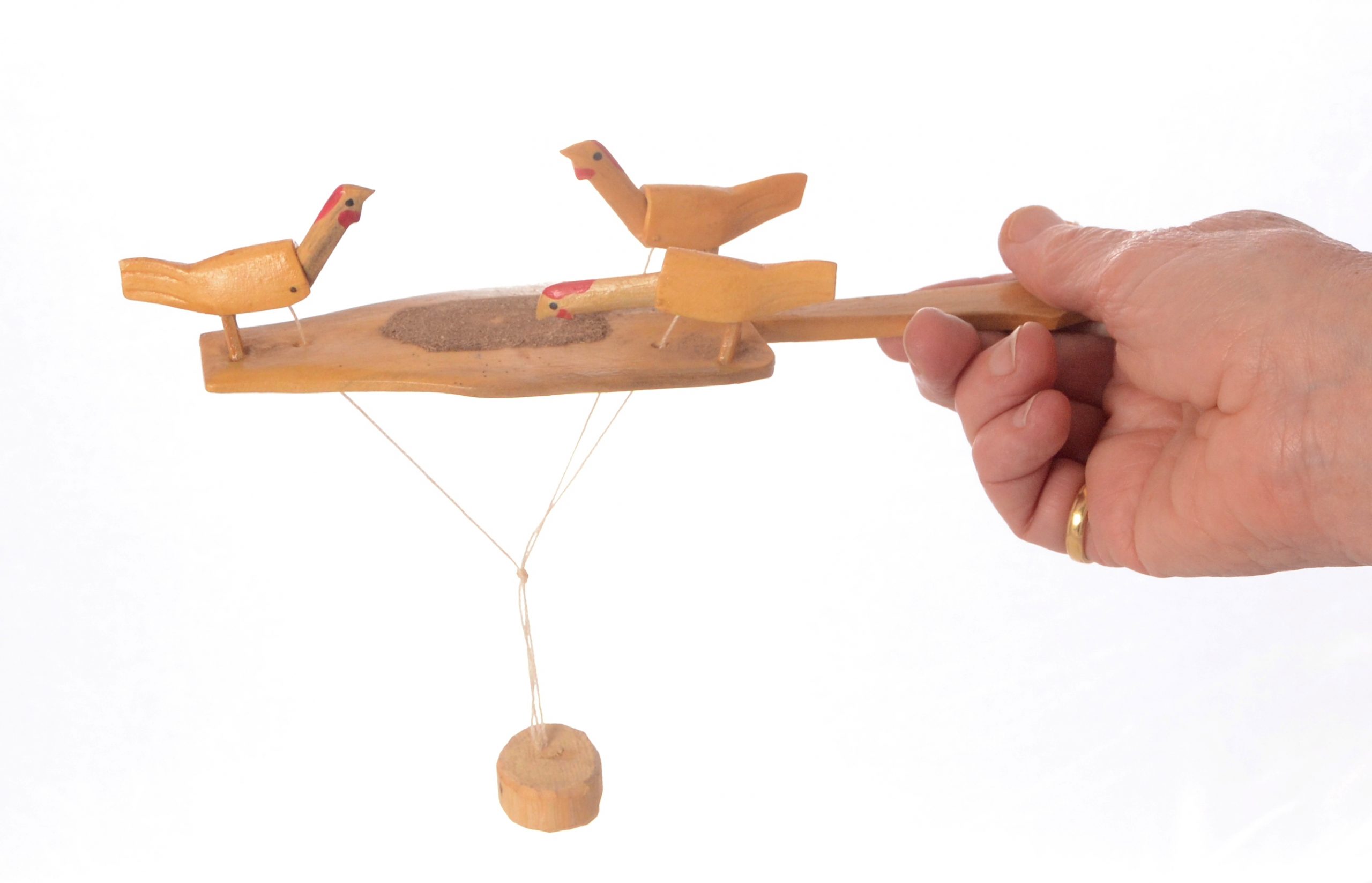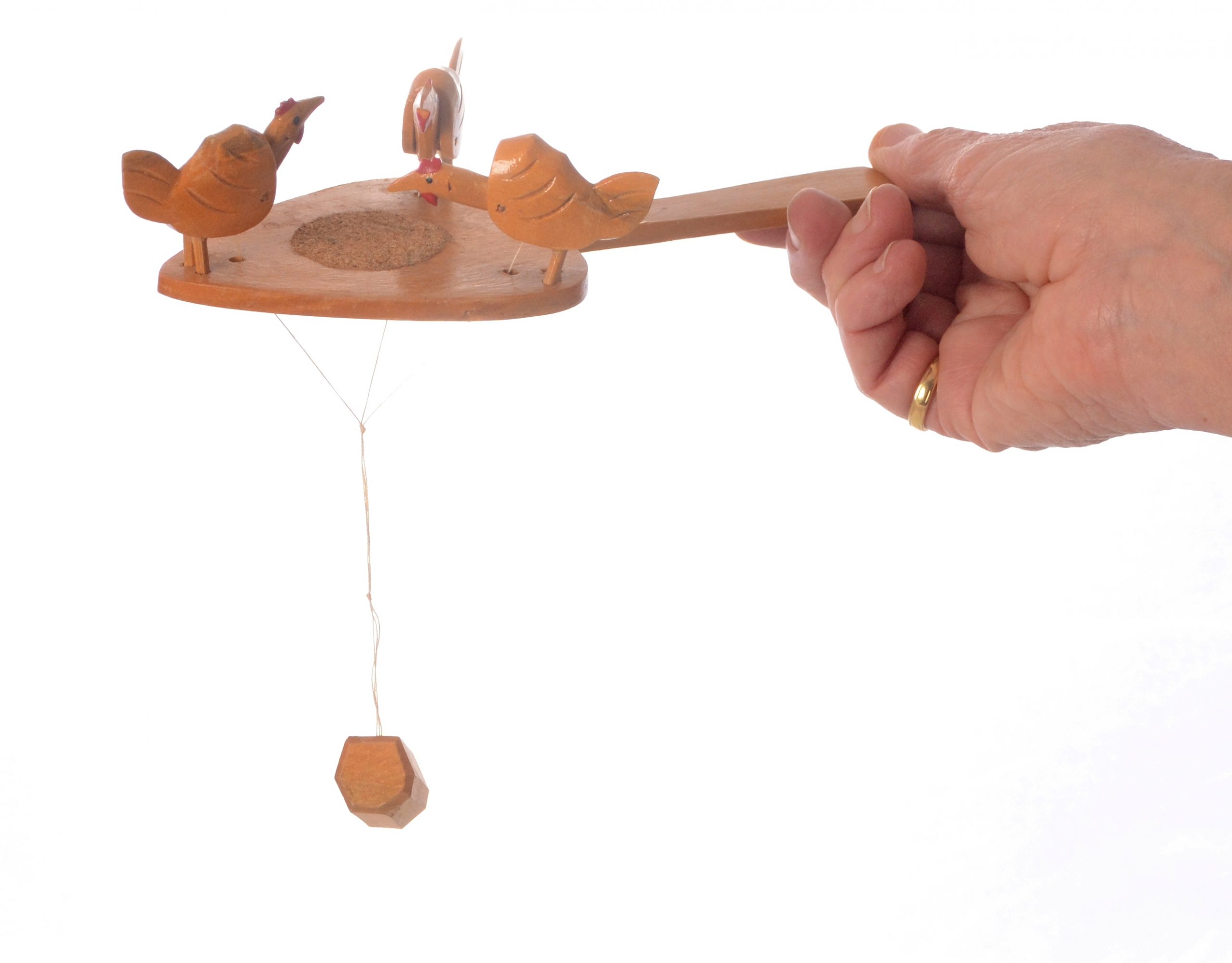 Durch einfaches Herunterziehen an der unteren Holzscheibe bewegen sich die Hühner.
