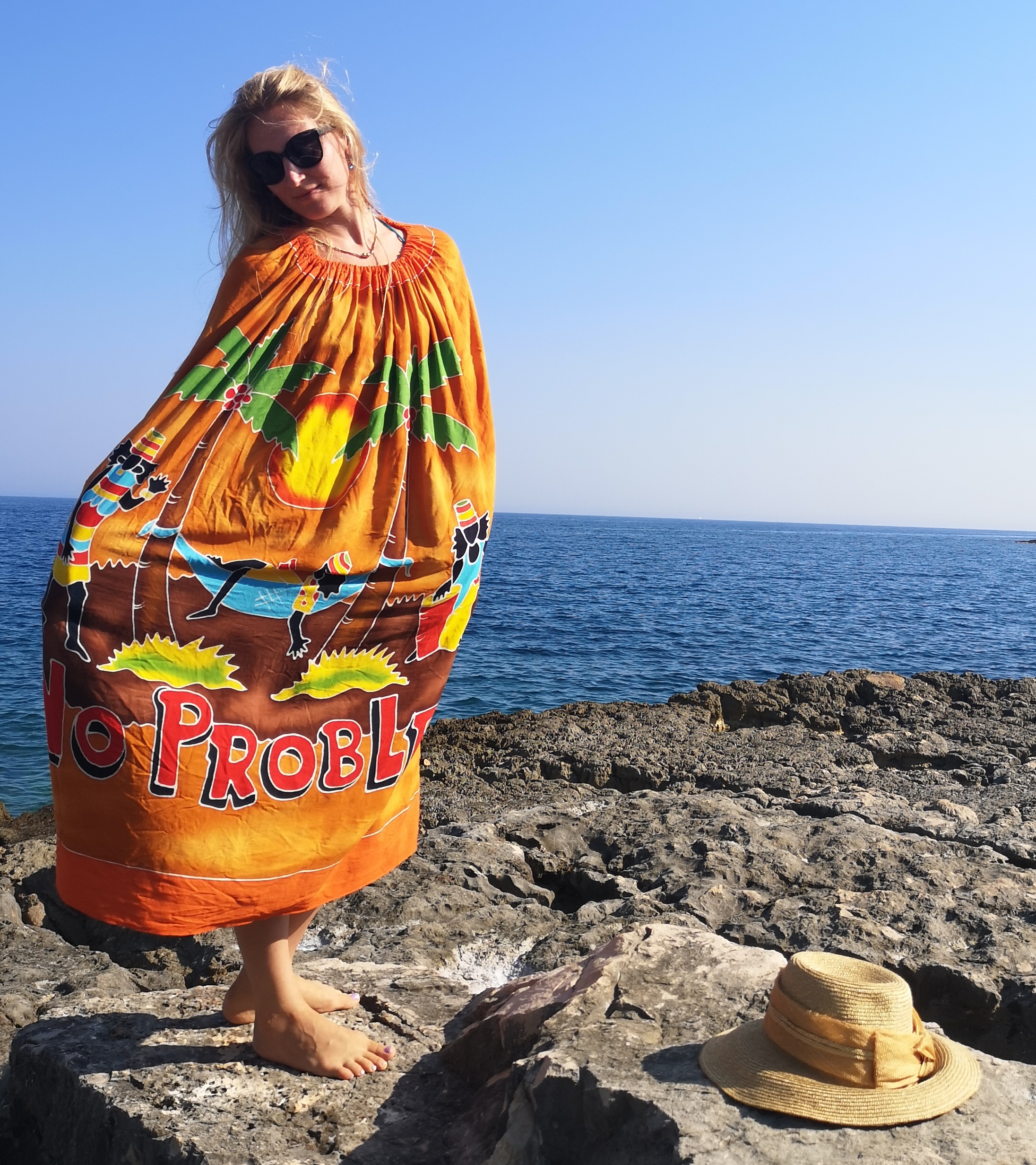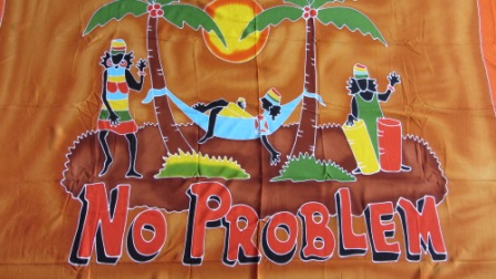 Das „No-Problem“-Motiv verleiht dem Sarong eine exotische Note und macht so diesen vielseitig einsetzbar: als farbenfrohe Strandmode sowie auch als exotische Tischdecke oder sommerliche Freizeitdecke.