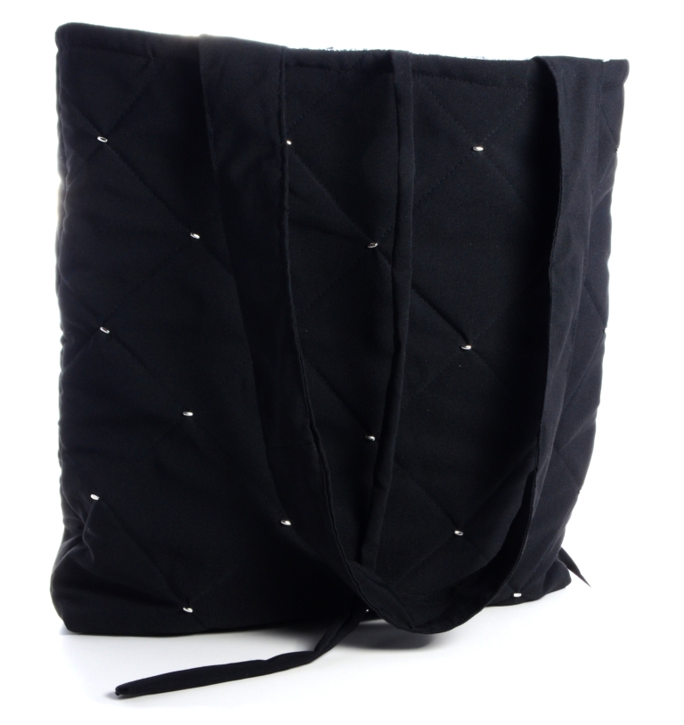 Diese schöne schwarze Stofftasche mit dekorativen Absteppungen und passenden Deko-Perlen ist für alle Gelegenheiten geeignet.